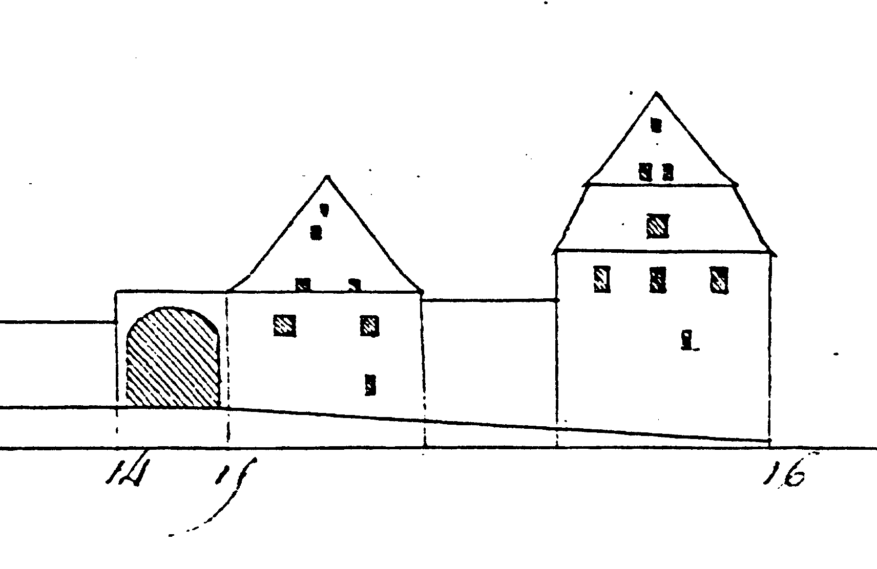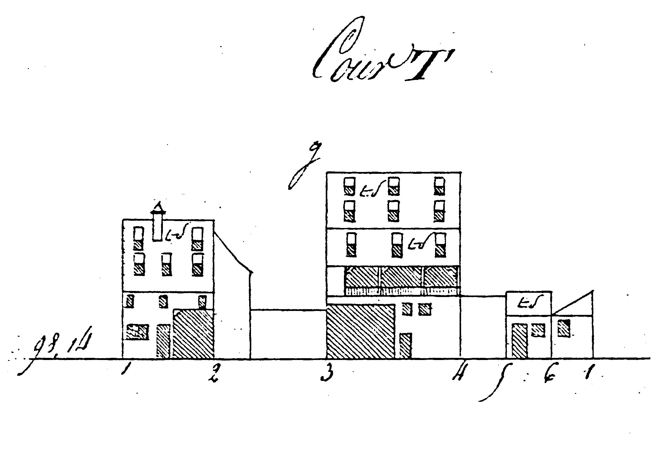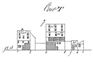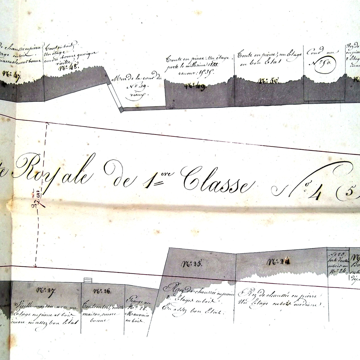 L’Atlas des alignements (années 1820) mentionne une maison à rez-de-chaussée en maçonnerie et un étage en bois. Sur les élévations préparatoires au plan-relief de 1830, la façade (n’-o’) comprend une porte cochère, une porte ordinaire et deux fenêtres au rez-de-chaussée, trois ouvertures à l’étage et une toiture à deux niveaux de lucarnes. La cour T derrière le bâtiment sur rue (1-2) montre la propriété à l’ouest (2-3), le bâtiment (3-4) au fond de la cour (étage à galeries, toiture à deux inclinaisons et trois niveaux de lucarnes), le mur (4-5) vers le voisin à l’ouest et le bâtiment (5-6-1) à l’angle sud-est. La cour R du voisin (Tieffenhoff) représente le pignon du bâtiment sur rue et celui du bâtiment au fond de la cour.