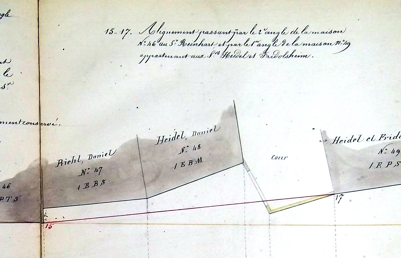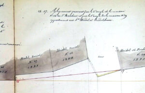 M. Heydel de cujus en était propriétaire pour l’avoir recueilli dans la succession de ses père et mère M Daniel Heydel et Mad° Marie Friedolsheim, son épouse, demeurant à Strasbourg, aux termes d’un partage dressé par M° Hatt, notaire à Strasbourg le 6 novembre 1841 et d’un partage rectificatif passé devant M° Lauth notaire à Strasbourg le 18 novembre 1853. (…) Prix 21.500 francs