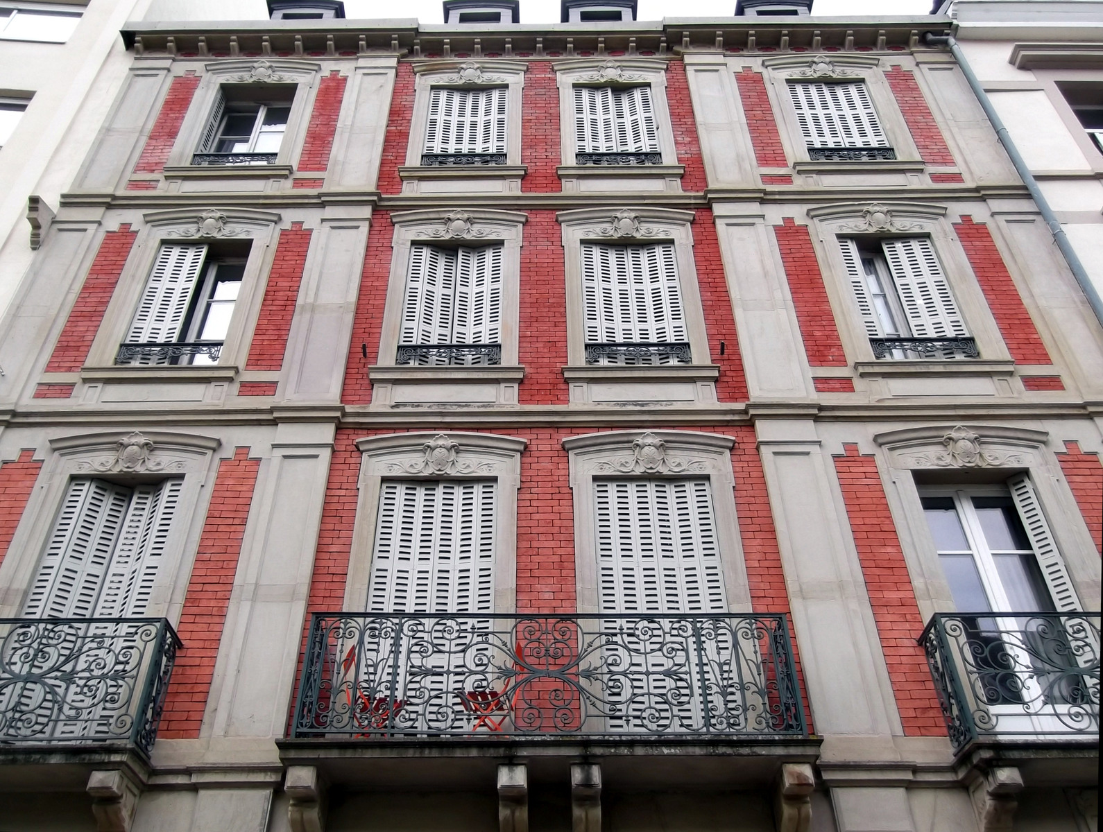 Portail – Etages (août 2025) Des bandes de briques rouges longent les encadrements de fenêtre, quatre séries de colonnes longent les bandes de briques. Les fenêtres sont surmontées de moulures et de linteaux arqués, les étages séparés par des cordons. Les portes-fenêtres du premier étage sont précédées de balcons.