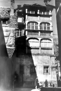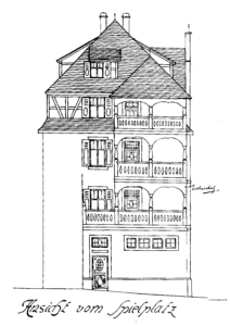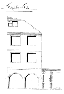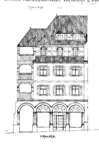 • 1752 (billet d’estimation traduit) La maison comprend à côté de l’entrée la boutique et le bureau, au premier étage un poêle, cuisine et vestibule, au deuxième étage deux chambres, au-dessus le comble à double couverture de tuiles plates, une cave en partie voûtée en partie solivée, un puits et une petite cour, item un petit bâtiment arrière comprenant plusieurs petites chambres, comble à double couverture de tuiles plates, le tout estimé avec appartenances et dépendances à la somme de 1000 florins