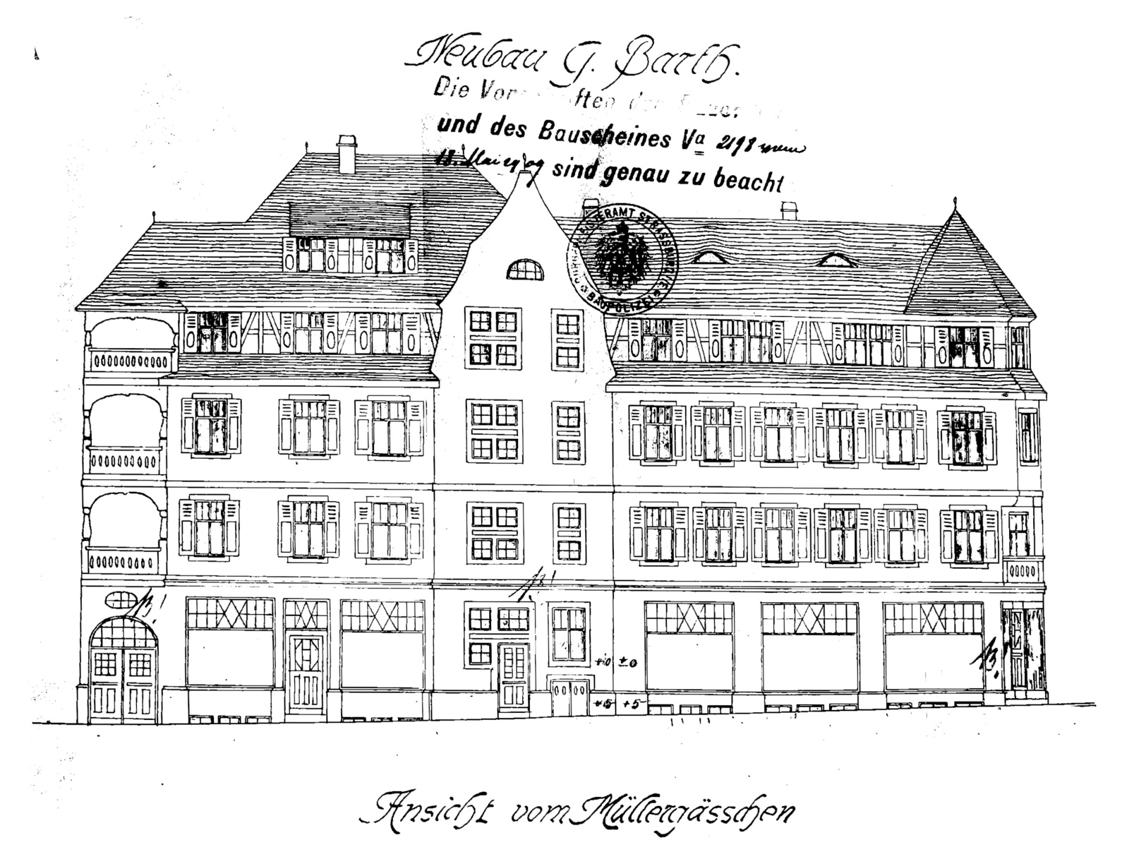 Elévation sur la rue des Meuniers – Partie de la même élévation selon l’avenant – Elévation arrière (1909, dossier 798 W 153) – Photographie de Charles Spehner (1 Fi 146)