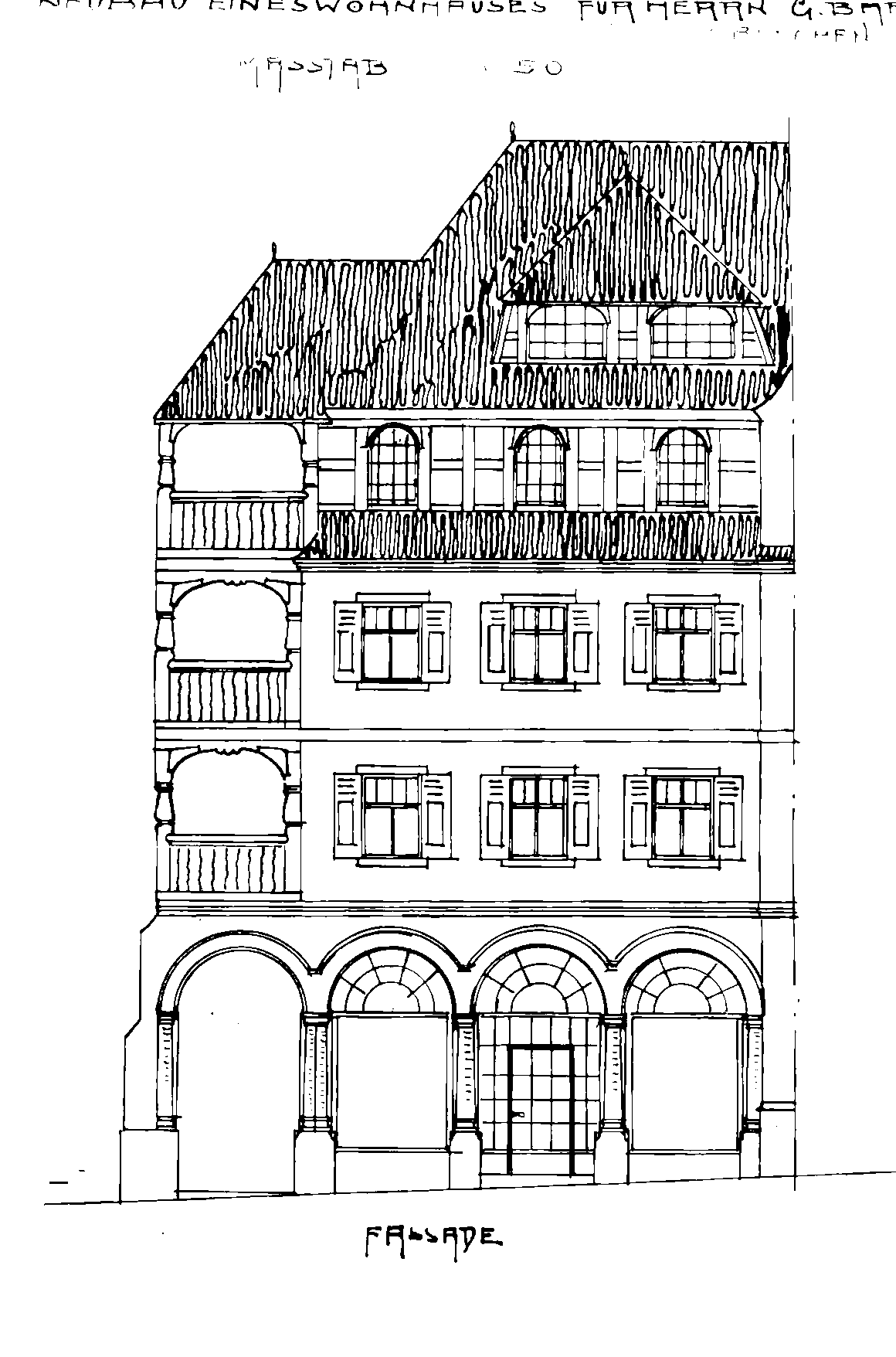 • 1726 (billet d’estimation traduit) La maison comprend un vieux bâtiment accessoire, plusieurs poêles, chambres, chambre à marchandises, chambre à soldats, boutique et bureau, vestibule où se trouvent le fourneau et le puits, cave en partie voûtée en partie solivée, estimée avec appartenances et dépendances à la somme de 750 florins