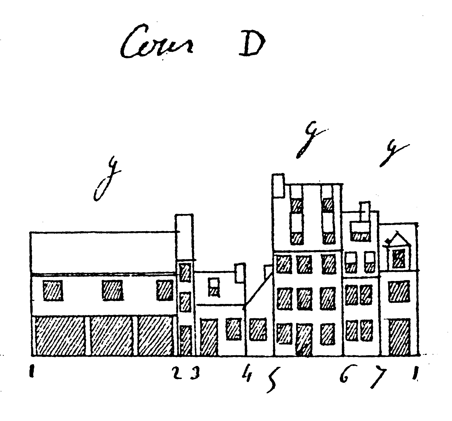 L’Atlas des alignements (années 1820) mentionne une maison à deux étages en maçonnerie. Sur les élévations préparatoires au plan-relief de 1830, la façade se trouve à droite du repère (d) : deux fenêtres et une porte au rez-de-chaussée, trois fenêtres à chacun des deux étages, toiture à un niveau de lucarnes. La cour D montre l’arrière (2-3) de la façade sur rue, les remises (2-1) à droite de la cour, le bâtiment (1-7) qui s’ouvre au fond de la cour, le bâtiment (3-4-5) à gauche de la cour en sortant du bâtiment principal et les maisons voisines (5-6-7) dont la première a une porte.