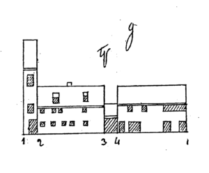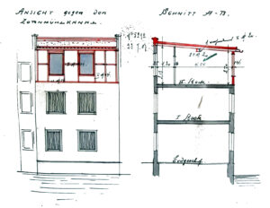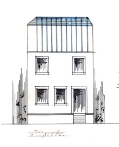 – ladite maison a une petite avance vers la prison militaire qui se termine en pointe à l’autre extrémité j’estime que l’on pourroit autoriser le crepissage du rez de chaussée qui est aligné sans toucher à cette demi avance, Reiner
