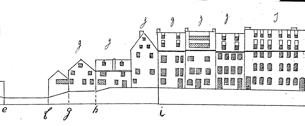 L’Atlas des alignements (années 1820) mentionne une maison à rez-de-chaussée en maçonnerie et deux étages en bois. Sur les élévations préparatoires au plan-relief (1830), la façade vers la place se trouve à droite du repère (i) ; fenêtre et porte au rez-de-chaussée, trois fenêtres aux premier et deuxième étage, toiture à deux niveaux de lucarnes. Le pignon à gauche de (i) a une fenêtre au rez-de-chaussée, deux à chacun des deux étages. Le pignon du bâtiment le long de la rivière se trouve en (f-g), sa façade en (19-20) de la cour H (canal). La cour I représente le bâtiment avant (1-2), l’arrière (2-3) du bâtiment voisin à l’ouest, le bâtiment arrière (3-4) et celui (4-1) à droite de la cour.