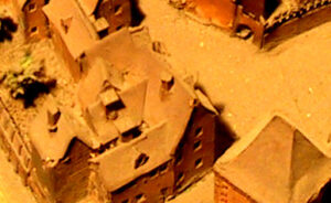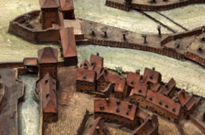 La maison est la partie gauche du bâtiment à l’angle vers les ponts couverts – Pignon d’angle et bâtiment vers le canal à gauche (Plan-relief de 1727)