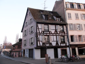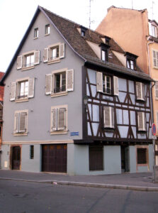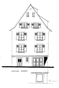 Désignation. Une maison à rez de chaussée et deux étages avec cour et autres appartenances et dépendances, située à Strasbourg rue du Finckwiller n° 1, formant d’un côté le coin de cette rue et de la rue des ponts couverts, tenant de l’autre côté au Sr Baldner par derrière à la veuve Stauffert et à un bras de l’Ill.
