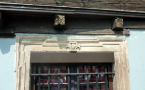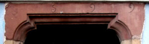 Millésime 1599 sur le linteau de la porte rajoutée au XX° siècle – Encadrement à crossettes, ancienne porte convertie en fenêtre vers la place, image Roland Burckel)