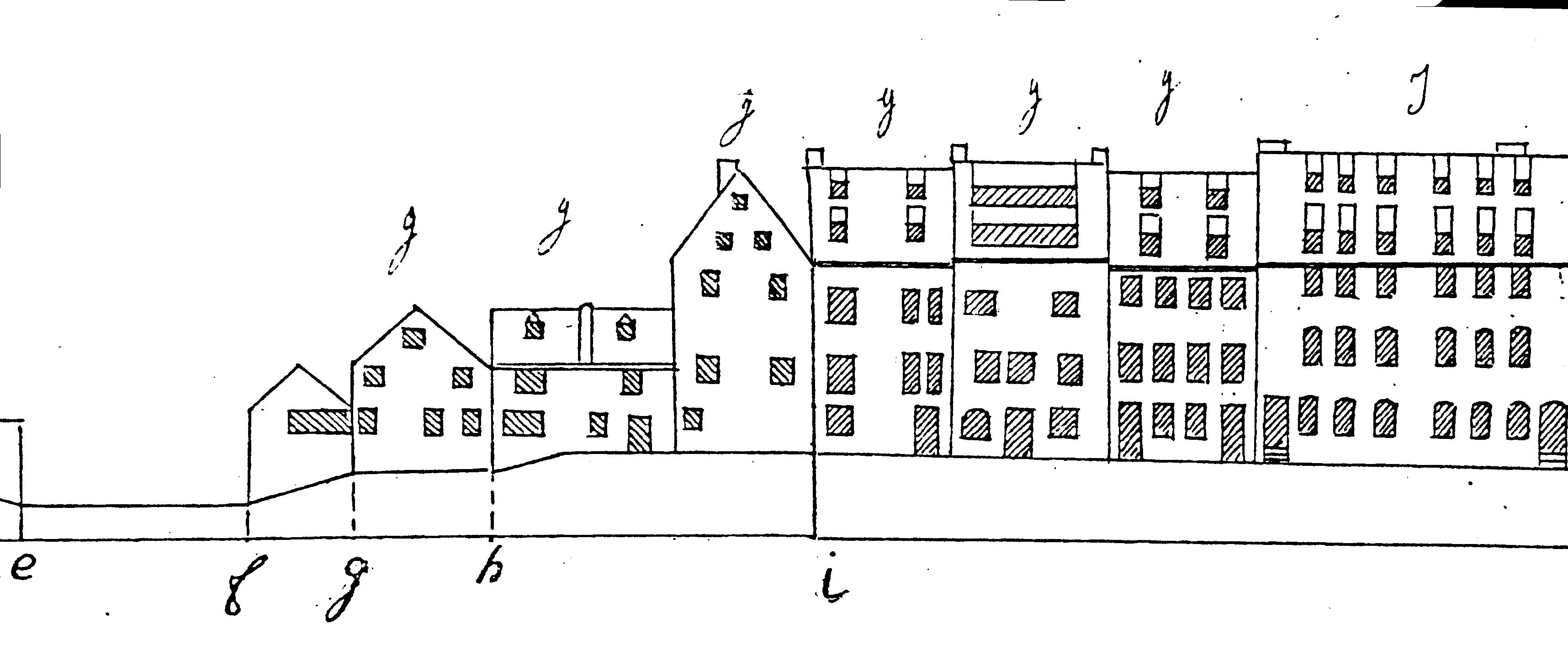 L’Atlas des alignements (années 1820) mentionne une maison à rez-de-chaussée en maçonnerie et deux étages en bois. Sur les élévations préparatoires au plan-relief (1830), la façade vers la place se trouve à droite du repère (i) ; fenêtre et porte au rez-de-chaussée, trois fenêtres aux premier et deuxième étage, toiture à deux niveaux de lucarnes. Le pignon à gauche de (i) a une fenêtre au rez-de-chaussée, deux à chacun des deux étages. Le pignon du bâtiment le long de la rivière se trouve en (f-g), sa façade en (19-20) de la cour H (canal). La cour I représente le bâtiment avant (1-2), l’arrière (2-3) du bâtiment voisin à l’ouest, le bâtiment arrière (3-4) et celui (4-1) à droite de la cour.