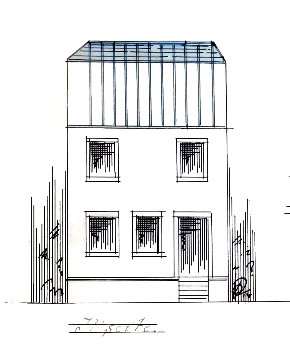 – ladite maison a une petite avance vers la prison militaire qui se termine en pointe à l’autre extrémité j’estime que l’on pourroit autoriser le crepissage du rez de chaussée qui est aligné sans toucher à cette demi avance, Reiner