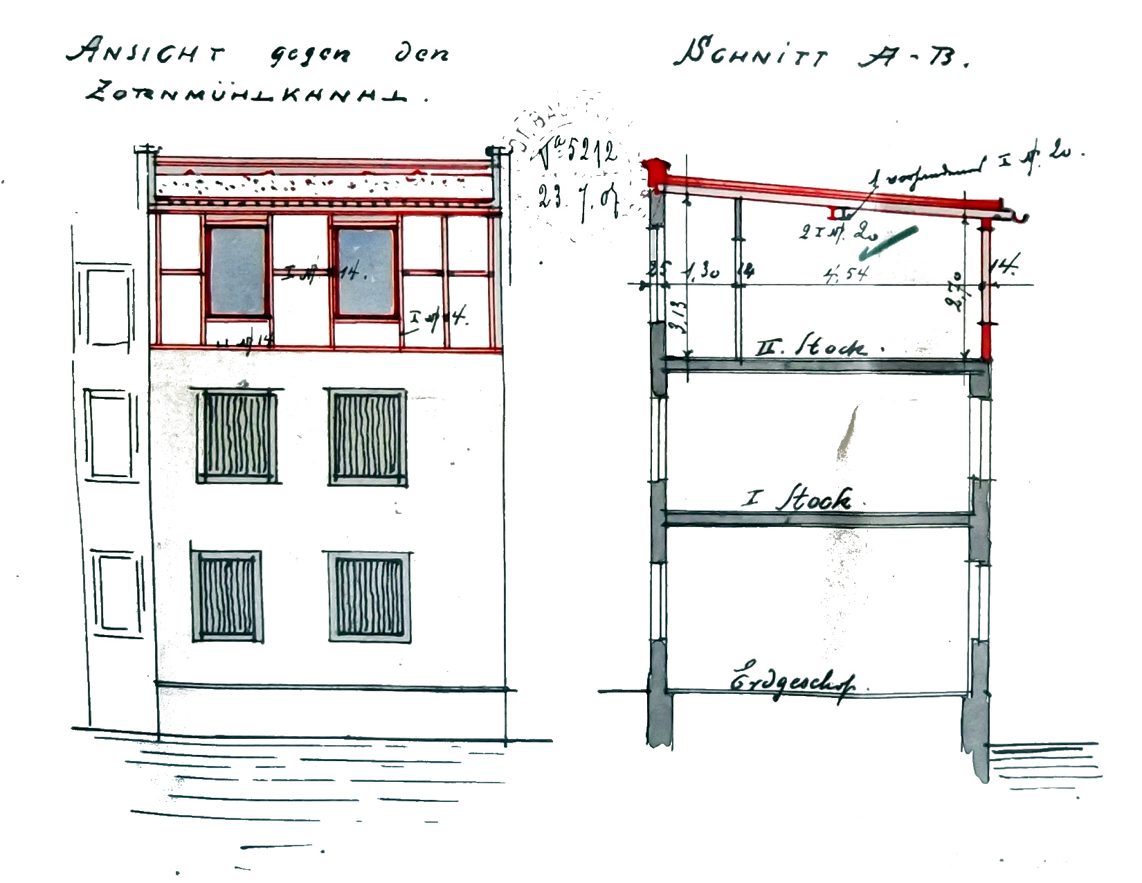 Façade vers l’Ill avant et après transformation (1899) – Construction en pan de bois (1907), dossier 845 W 165)