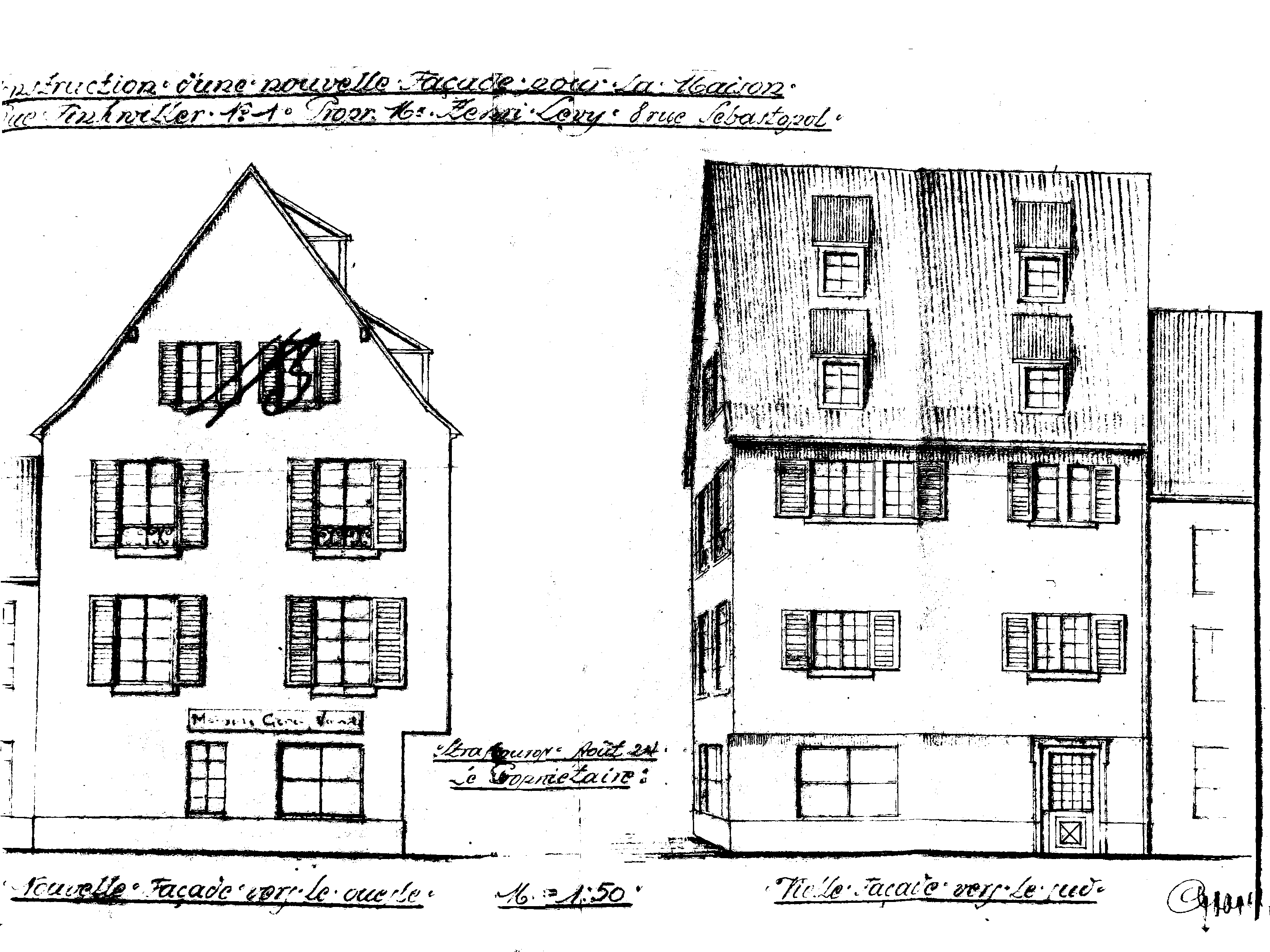 Etablissement de propriété. La dite maison appartient à M. Mathis au moyen de la donation qui lui en a été faite par le Sr Chrétien Samuel Mathis, son père, marchand de poissons à Strasbourg, aux termes d’un acte passé devant M° Stromeyer notaire à Strasbourg en présence de deux témoins le 8 novembre 1864, transcrit au bureau des hypothèques la même ville le 24 juin 1865 volume 1007 N° 24. Cette donation a été faite I. sous la charge de laisser à son père donateur à titre gratuit et viager le logement du premier étage et de le nourrir et soigner tant en santé qu’en maladie, laquelle charge se trouve aujourd’hui éteinte le Sr. Mathis père étant décédé le 30 mars 1866. II. sous la condition de payer (le montant d’obligations) 5600 francs. Ladite maison appartenait au Sr Mathis pere pour en avoir recueilli un 7° dans la succession de D° Catherine Salomé Weber, veuve de M. Jean Mathis, vivant marchand de poissons à Strasbourg, sa mère dont il était héritier pour pareille portion. Et pour avoir acquis les six 7° restants de ses frères et sœurs à titre de licitation aux termes d’un contrat passé devant ledit M° Grimmer le 30 juin 1821, lequel contient quittance du prix y stipulé, le tout ainsi que les vendeurs le déclarent