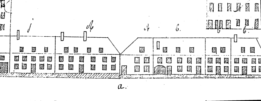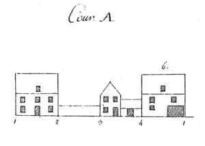 L’Atlas des alignements (années 1820) mentionne une maison à rez-de-chaussée et un étage en maçonnerie. Sur les élévations préparatoires au plan-relief de 1830, la façade vers la rue des Maisons Rouges se trouve à gauche du repère (a) : deux fenêtres, une porte puis trois fenêtres au rez-de-chaussée, six fenêtres à l’étage, toiture à quatre fenêtres. La façade correspondante vers la place, à droite de (a), comprend une porte et deux fenêtres au rez-de-chaussée, deux fenêtres à l’étage et une fenêtre dans la toiture. Elle est suivie du deuxième bâtiment à porte cochère, une porte, deux fenêtres et une autre porte au rez-de-chaussée, cinq fenêtres à l’étage et trois fenêtres dans la toiture. La cour A représente l’arrière (1-2) de la façade vers la rue, l’arrière (4-1) de celle vers la place, le côté ouest (3-4) de la cour où se trouvent les dépendances et la clôture (2-3) au sud.