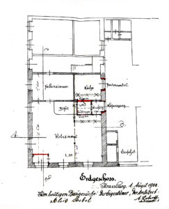 Plan du rez-de-chaussée, la partie droite de la salle d’auberge forme ensuite une salle annexe (1908, dossier 739 W 40)