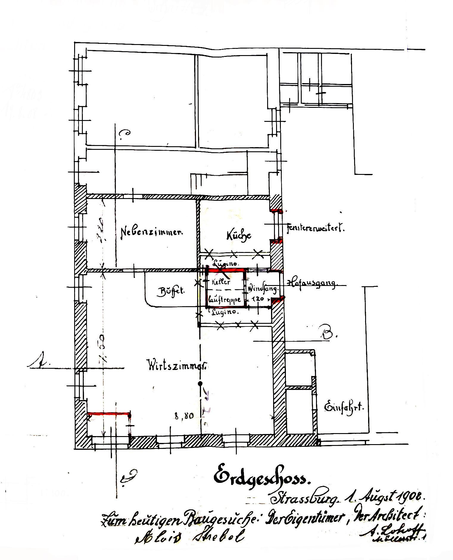 Das Anwesen gehörte zur bestandenen Gütergemeinschaft zwischen Hn Vasbender & seiner Ehefrau & wurde durch Ersteren ersteigert von den minderjährigen Kindern Charles, Chrétien, Louis, Eugène Arthur und Marie Sophie Haller, laut Versteigerungsprotokoll des Notars Ritleng des Aeltern in Strassburg vom 12. Juli 1860, überschrieben am Hypothekenamte Strassburg den 25. desselben Monats, Band 822 Nr. 1. mit amtlicher Einschreibung Band 763. N° 87. In’s Alleineigenthum dieses Anwesens gelangte Herr Vasbender als Universallegatar seiner verlebten Ehefrau, wie dies bereits oben bei der unter A beschriebenen Liegenschaft gesagt ist.
