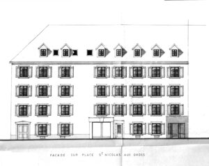 Autre adresse, 3, place Saint-Nicolas-aux-Ondes qui correspond à la fois au bâtiment d’angle et à la maison voisine, indépendante de 1736 à 1860