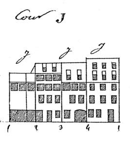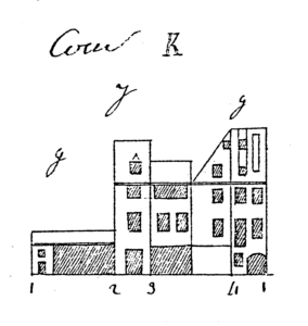 La cour J montre l’arrière (3-4) du bâtiment principal vers la place, le bâtiment (2-3) au nord, (1-2) à l’ouest et (1-4) au sud ; tous ont deux étages, sauf celui au nord dont une partie de la toiture a été convertie en étage ordinaire. La cour K montre l’arrière (1-4) du bâtiment Petite rue de la Grange, le bâtiment (4-3) à l’est correspondant en partie à celui (1-2) de la cour J, (2-3) au nord et la remise (1-2) à l’ouest.