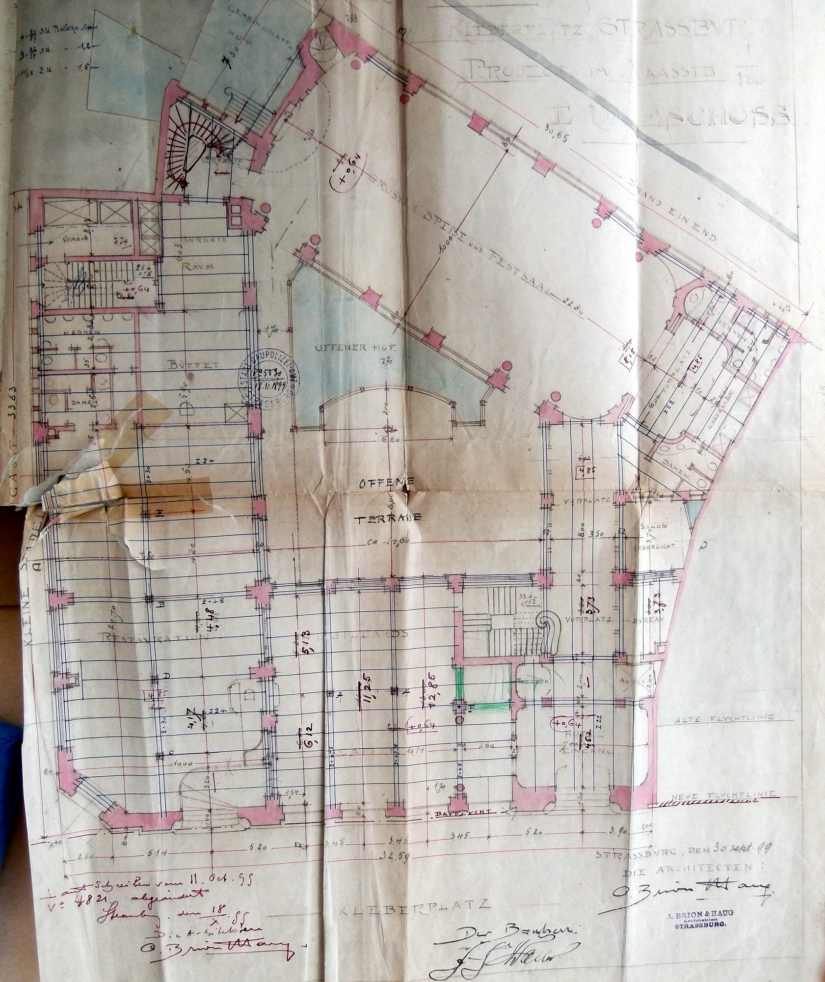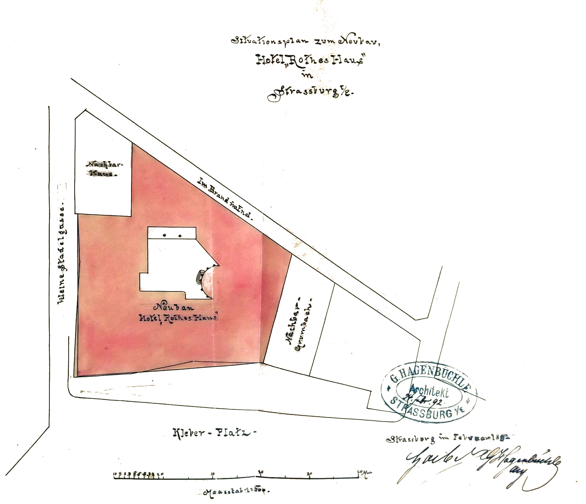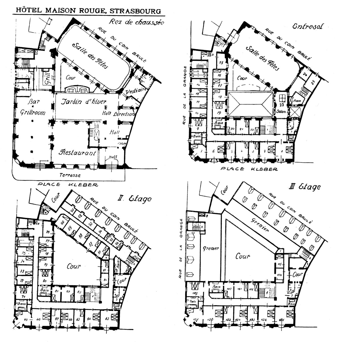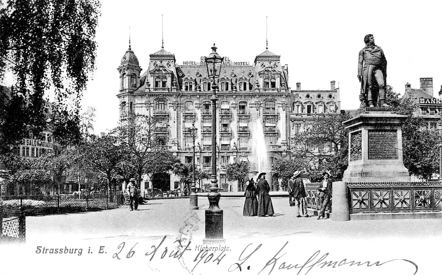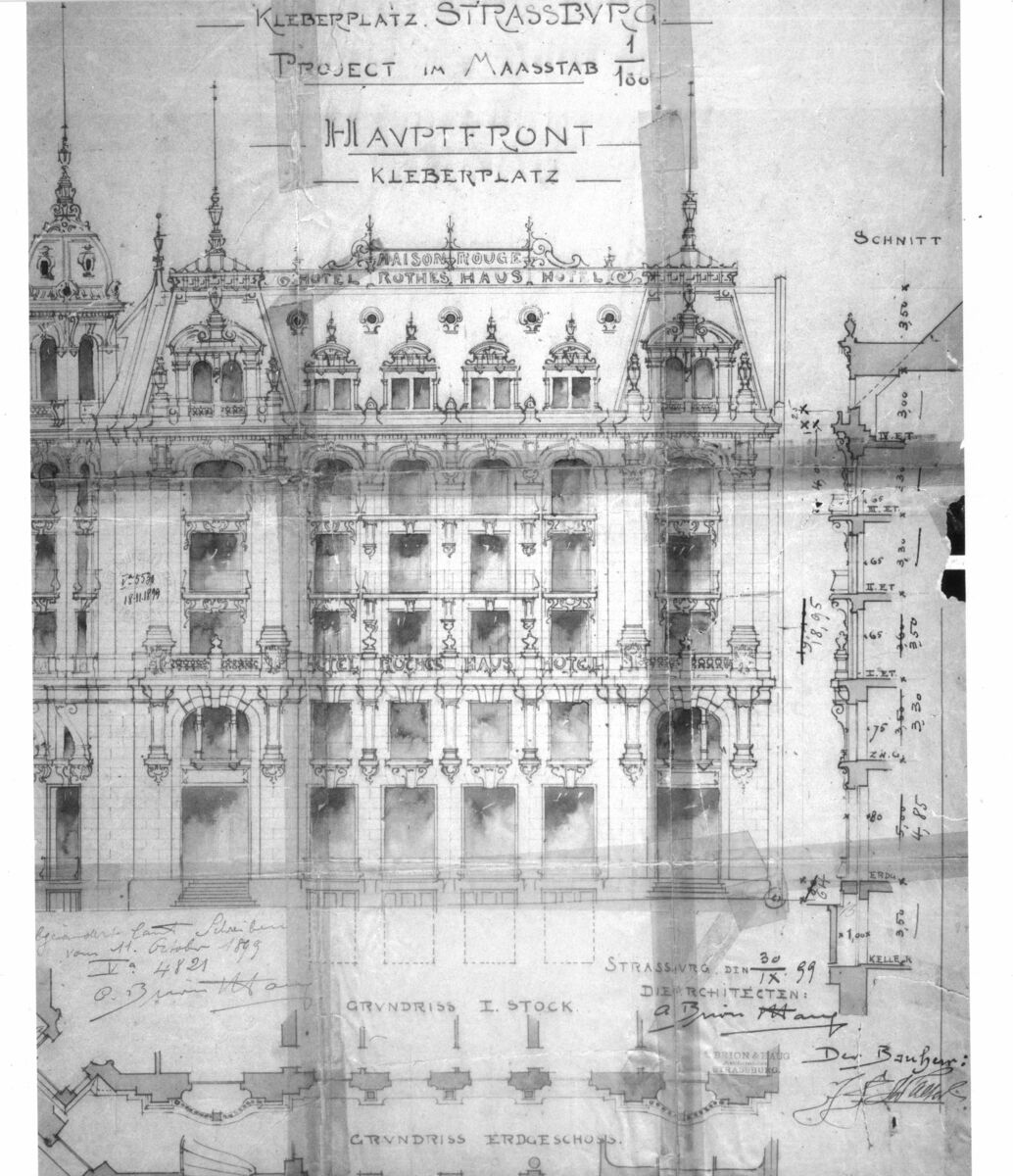 La Maison rouge est acquise en 1866 par l’hôtelier Martin Freysz puis par Alexandre Gœbel, ancien tenancier de l’hôtel d’Angleterre, qui l’hypothèque à plusieurs reprises, notamment au profit de la société Frères Eckel pour des sommes de plus en plus élevées. Les différentes pièces sont décrites en 1866 et en 1887. Alexandre Gœbel demande en 1892 l’autorisation de reconstruire sous la direction de l’architecte Gustave Hagenbüchle un hôtel de soixante-et-onze chambres ; le projet n’a pas de suite. Jean Frédéric Walter achète la Maison rouge en 1893. Il demande en mars 1899 à la Ville de fixer l’alignement légal qui est avancé place Kleber et reculé Petite rue de la Grange. L’hôtel est endommagé par un incendie en avril 1899, l’architecte entrepreneur Othon Back démolit les anciens bâtiments dont il ne reste que le rez-de-chaussée en juin 1899. Le maire accorde le 18 septembre 1899 à Jean Frédéric Walter puis le 18 novembre aux architectes Albert Brion et Eugène Haug l’autorisation de construire un hôtel à quatre étages en dépassant la hauteur réglementaire Petite rue de la Grange (cage d’escalier) et place Kleber (tourelle d’angle) et en suivant le nouvel alignement. Le préfet accorde en octobre 1900 sous conditions l’autorisation de recouvrir la cour (jardin d’hiver) d’un toit vitré. L’aménagement intérieur est en cours en février 1901.