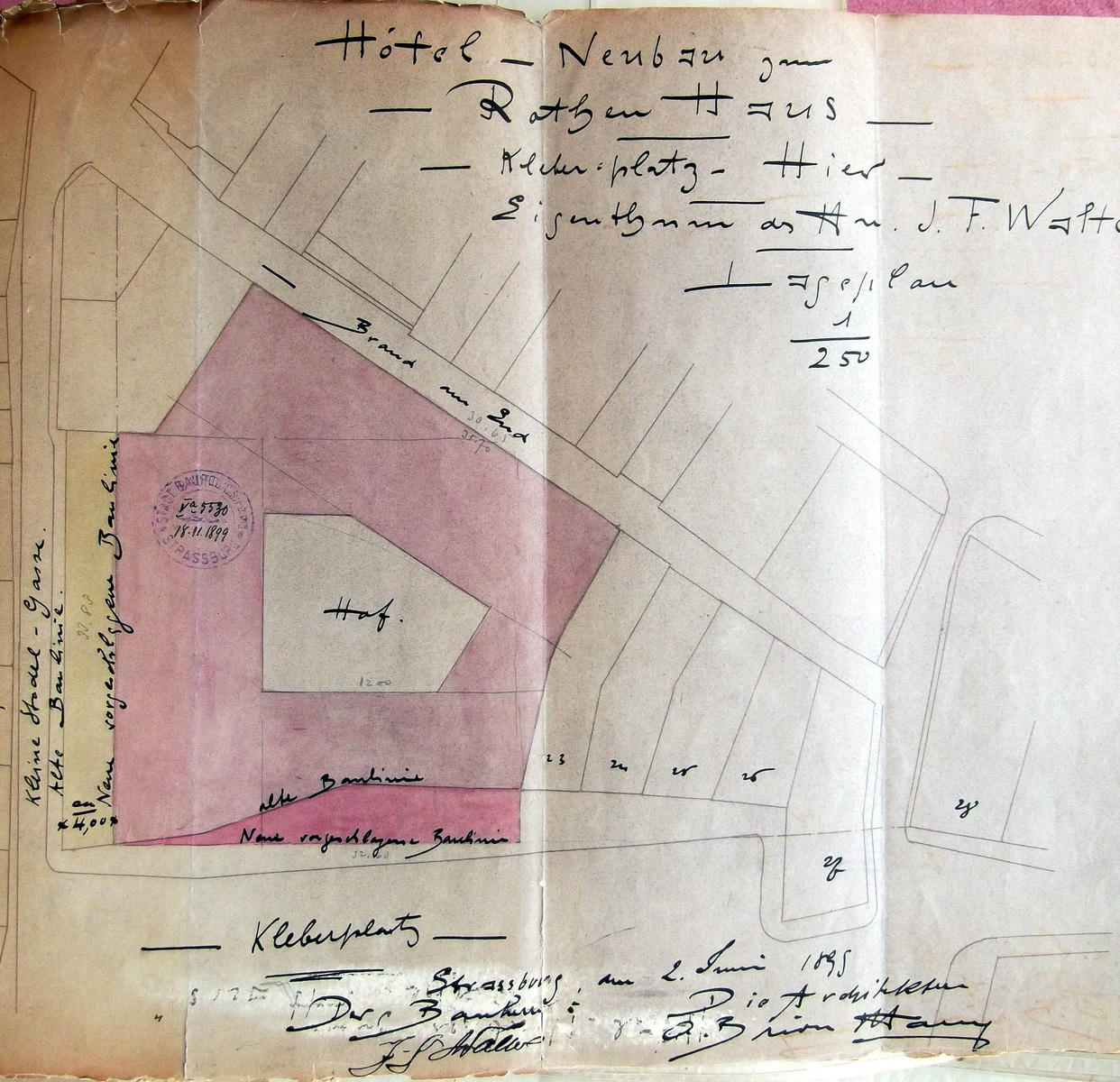 Stadt Strassburg, Blatt 259 des Eigentumsbuchs, das Grundstück eingetragen auf diesem Blatt des Eigentumsbuchs bestehet aus allen darauf aufgeführten Hotel$ gelegen Kleberplatz N° 22 in welchem die verkaufende Gesellschaft ein Hotel-Restaurant betreibt, bekannt unter der oben angegebenen Firma mit allen, was sich darin befindet, Mobilien, Einrichtungen, * und * um den Preis von 1.139.500 M, darauf abschläglich bezalt 180.000 M und der Rest mit 1.139.500