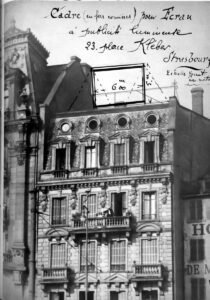 Le propriétaire Grumbach demande en novembre 1899 une indemnité pour transformer sa maison qui se trouve en arrière du nouvel alignement tracé pour construire la Maison Rouge voisine. Le conseil municipal ratifie le 25 avril 1900 la proposition de lui verser 20.000 marks et céder gratuitement le terrain communal entre son terrain et le nouvel alignement. Les architectes Brion et Haug sont autorisés en juin 1900 à transformer le bâtiment. La façade place Kleber est terminée en novembre, les étages sont habités en juillet 1901. Un litige entre la Police du Bâtiment et le propriétaire dure jusqu’en février 1903 quand la toiture vers la rue du Coin Brûlé a retrouvé son état initial.