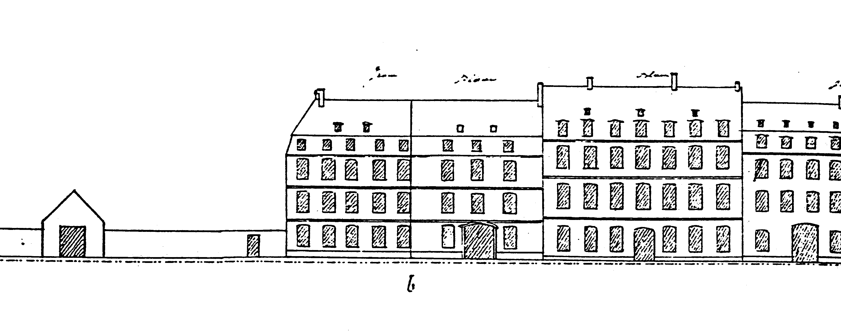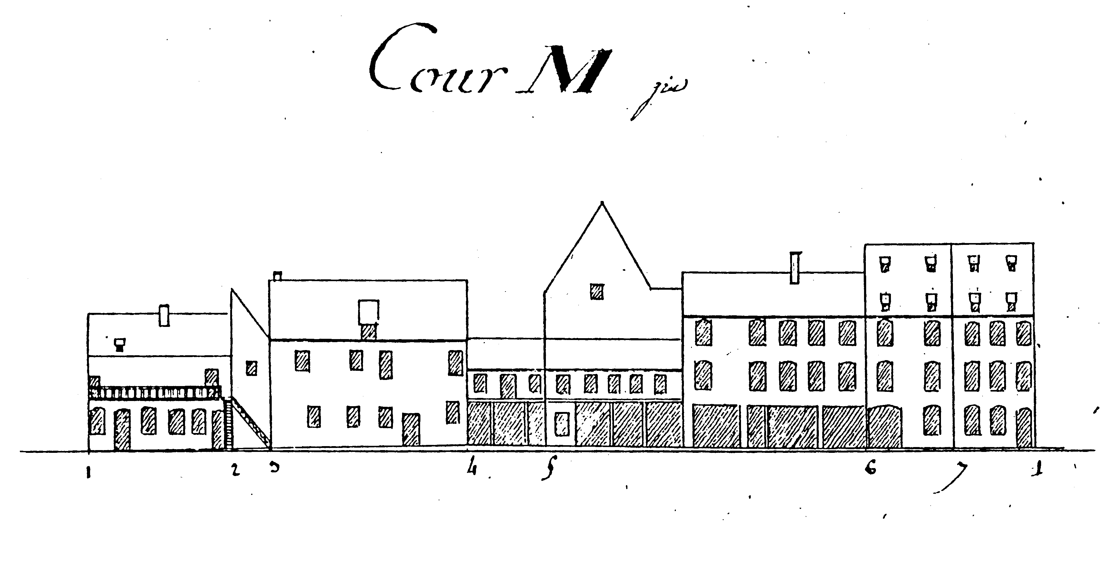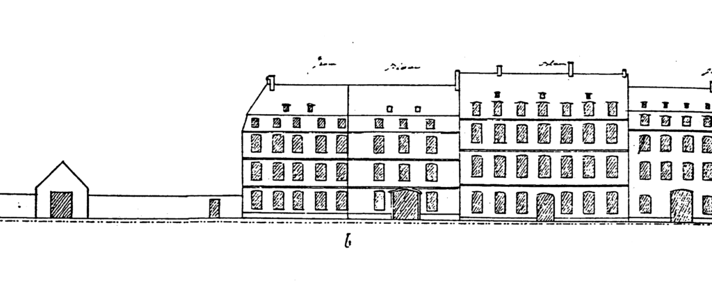 L’Atlas des alignements (années 1820) mentionne un bâtiment à rez-de-chaussée et deux étages en maçonnerie. Sur les élévations préparatoires au plan-relief de 1830, la façade se trouve de part et d’autre du repère (b) : la partie droite comprend au milieu le portail et une fenêtre de chaque côté, deux étages à trois fenêtres, étage mansardé et toiture à un niveau de lucarnes. La partie gauche (qui correspond à la construction de 1787) dont la largeur est identique à la première comprend cinq fenêtres à chaque niveau. La cour M représente l’arrière (1-7-6) de la façade sur quai. Le côté ouest comprend un premier bâtiment (1-2), suivi d’un autre (2-3-4) qui avance dans la cour. La remise (4-5) se trouve au fond de la cour dont le côté droit (5-6, à l’est) prolonge dans une première partie le bâtiment du fond, la deuxième partie étant comparable au bâtiment sur le quai.
