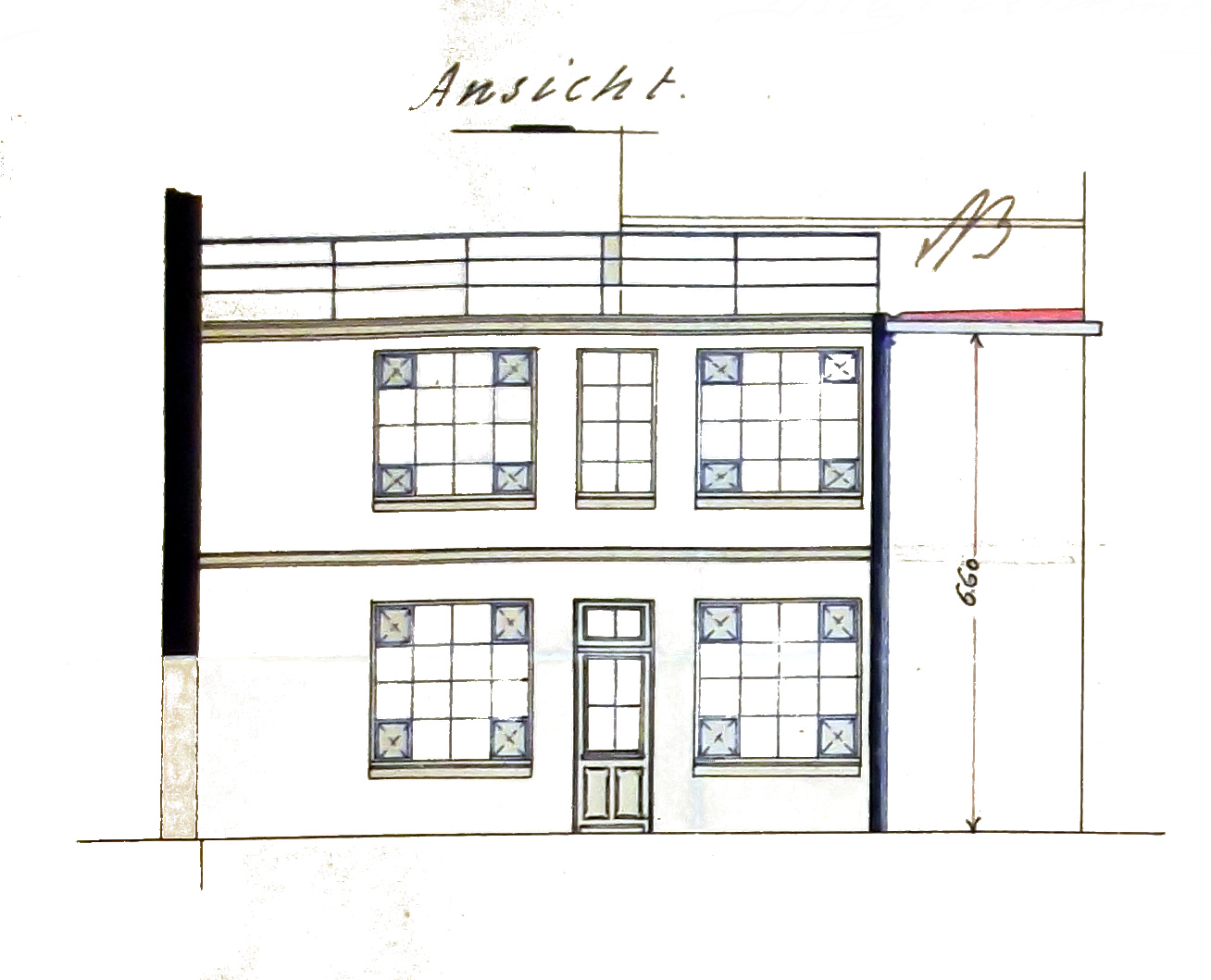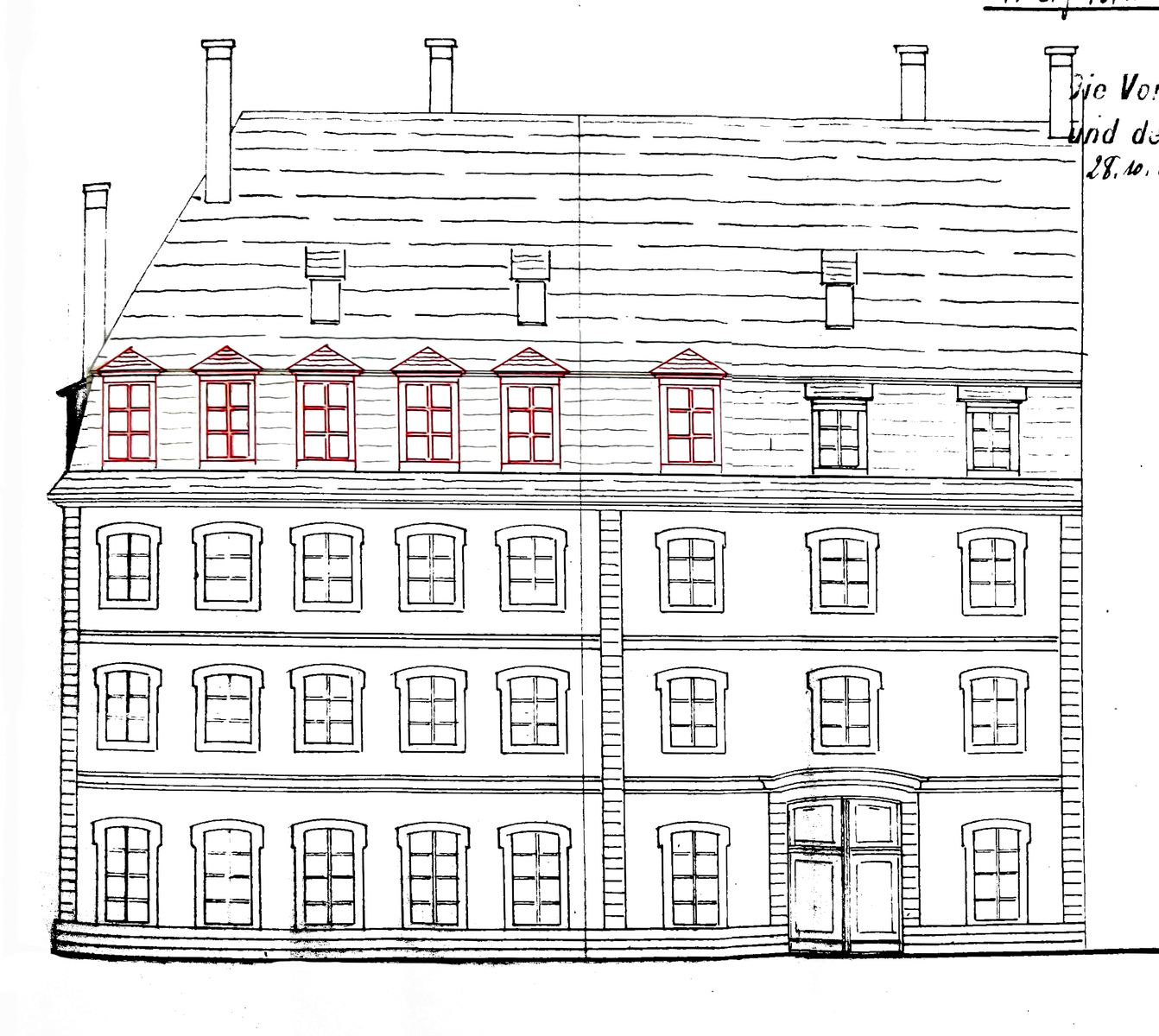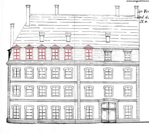 Elévation en 1909 lors de l’aménagement des mansardes (ajouts en rouge) puis en 1995 (dossier 1198 W 428)