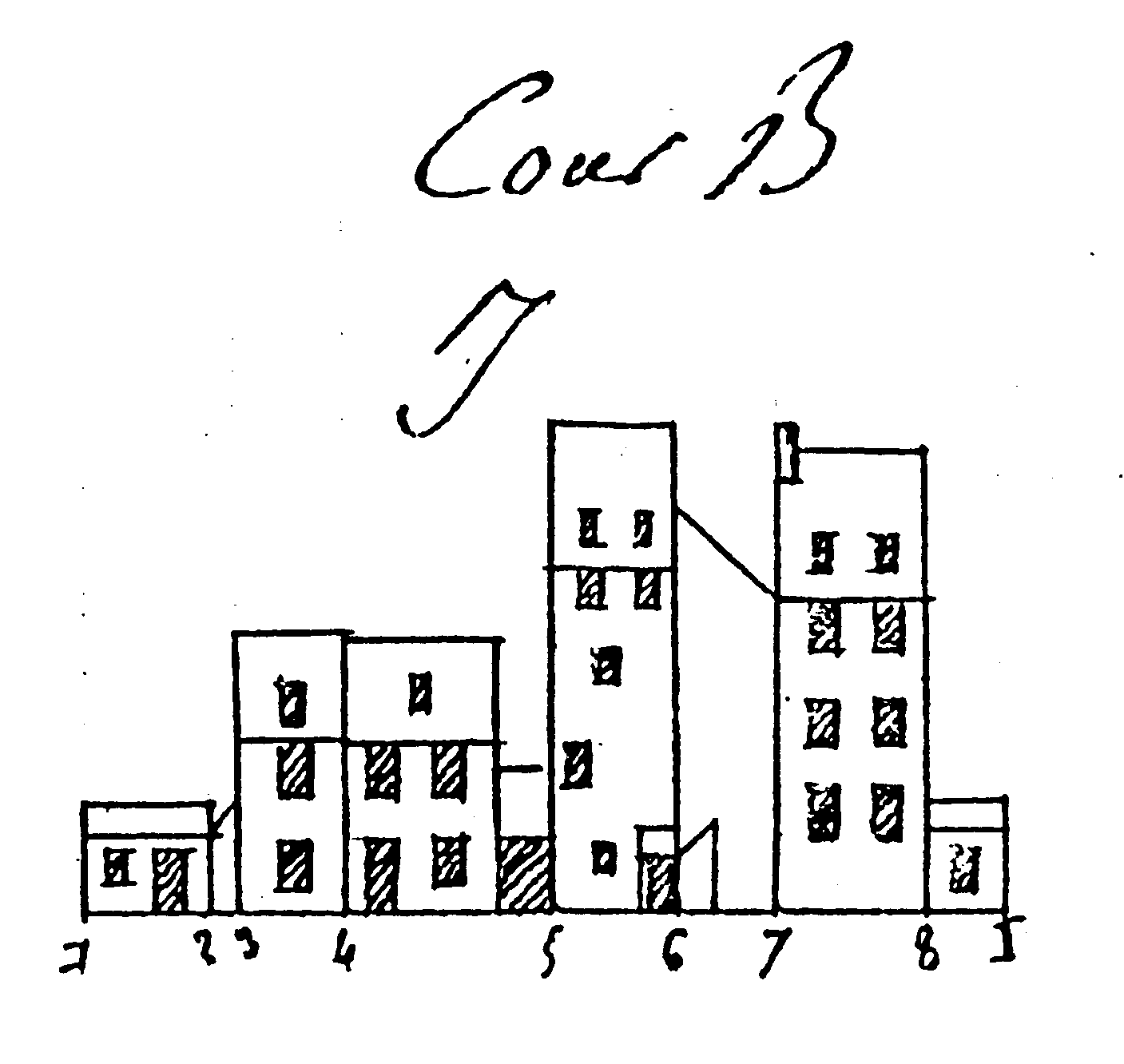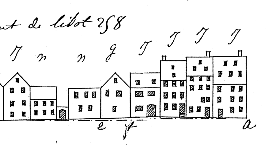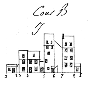 L’Atlas des alignements (années 1820) mentionne une maison à rez-de-chaussée et deux étages en maçonnerie. Sur les élévations préparatoires au plan-relief de 1830, la façade est la deuxième à droite de (f) : deux fenêtres au rez-de-chaussée, trois fenêtres à chacun des deux étages, toiture à deux niveaux de lucarnes. La cour B commune avec la maison voisine représente l’arrière (7-8) du bâtiment sur rue, le bâtiment (1-8) à l’ouest de la cour et celui (1-2) au fond de la cour.