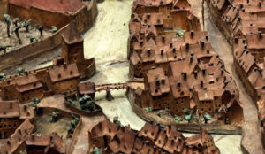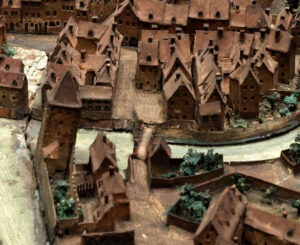 Plan-relief de 1727 (Musée historique). Le pont Sainte-Catherine est au milieu de l’image, la maison à pignon sur la droite – Vue de l’ouest, la façade le long du canal se trouve entre la tour et le pont