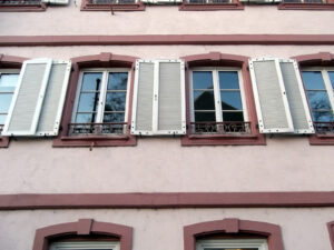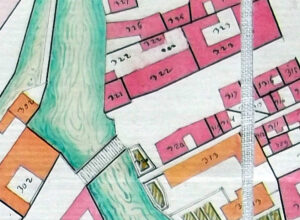 La veuve du menuisier Léonard Friedrich règle 11 sols 4 deniers pour sa maison, à savoir un auvent (18 pieds de long, saillie de 2 pieds), un cep de vigne entouré de planches (5 pieds ½ de long, saillie de 3 pieds), une treille qui s’appuie sur trois étais (18 pieds de long, saillie de 9 pieds), à l’arrière des latrines maçonnées sur des corbeaux en pierre (3 pieds de large, saillie de 2 pieds ½ sur le canal)