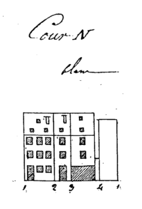 L’Atlas des alignements (années 1820) signale un bâtiment à rez-de-chaussée et deux étages en maçonnerie. Sur les élévations préparatoires au plan-relief de 1830, la façade sur rue est la deuxième à droite du repère (e) : fenêtre, porte, autre fenêtre et autre porte au rez-de-chaussée, deux étages à quatre fenêtres, toiture à deux niveaux de lucarnes. La cour N représente l’arrière (1-2) du bâtiment sur rue, le bâtiment latéral à gauche (est) de la cour, le bâtiment arrière (3-4), tous deux à rez-de-chaussée et deux étages. Les murs aveugles du côté droit (ouest) de la cour dépendent de la propriété voisine.